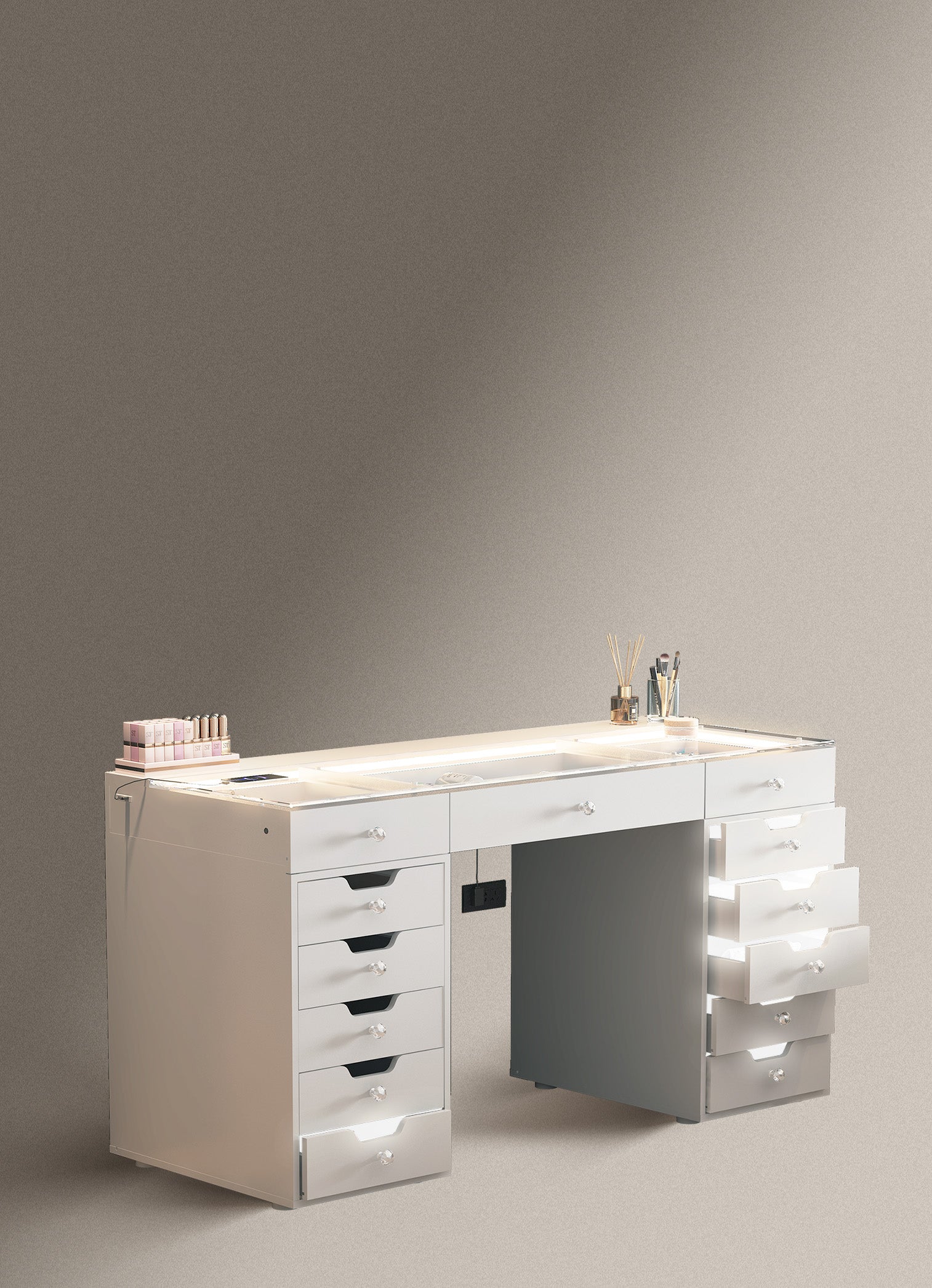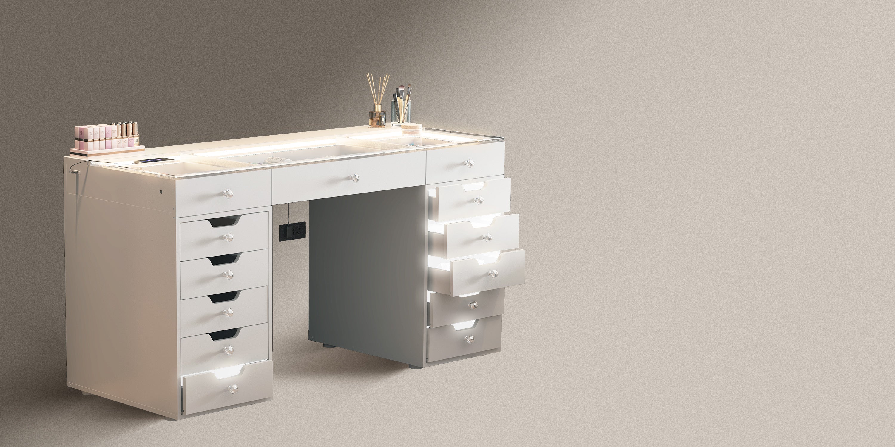 Multi-purpose Storage Drawers - 13 soft close large table drawers to help you organize your accessories.