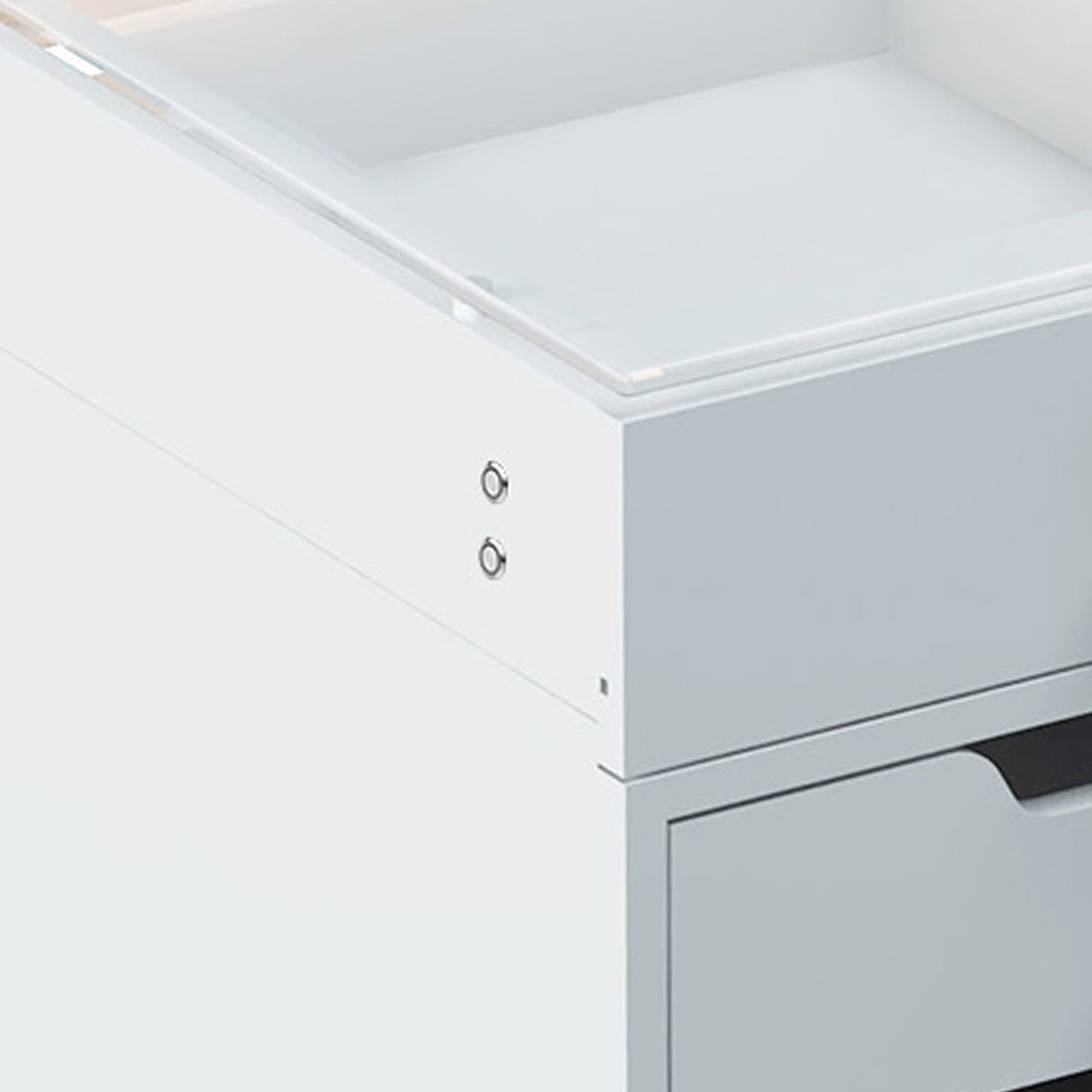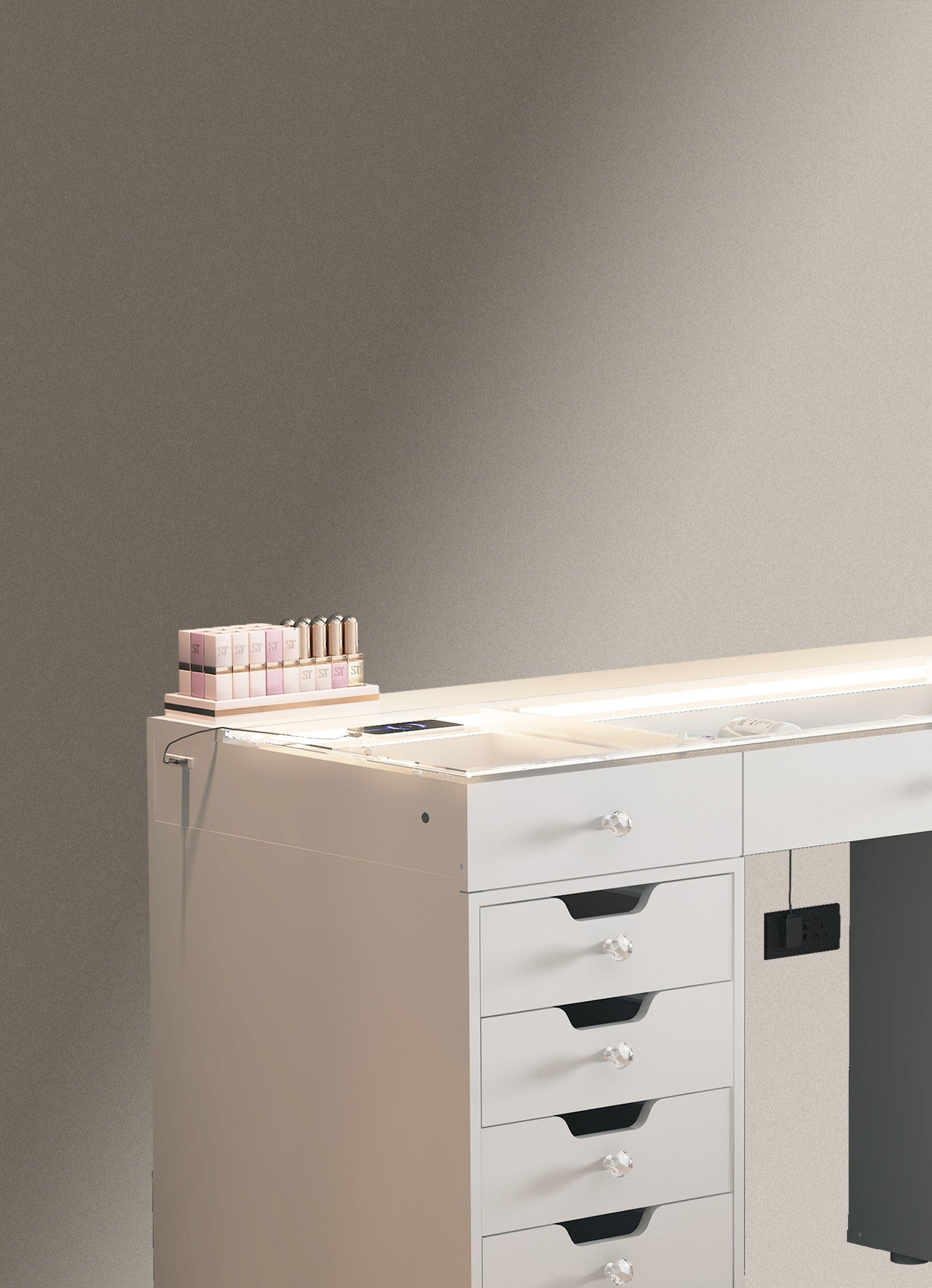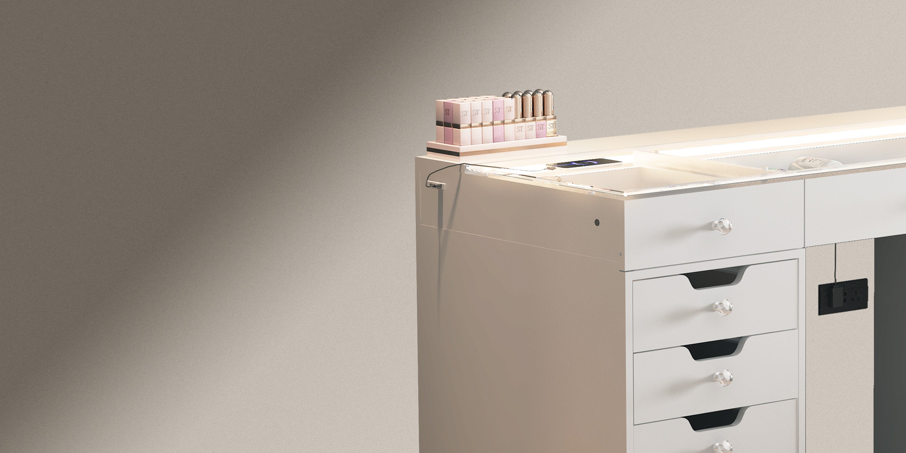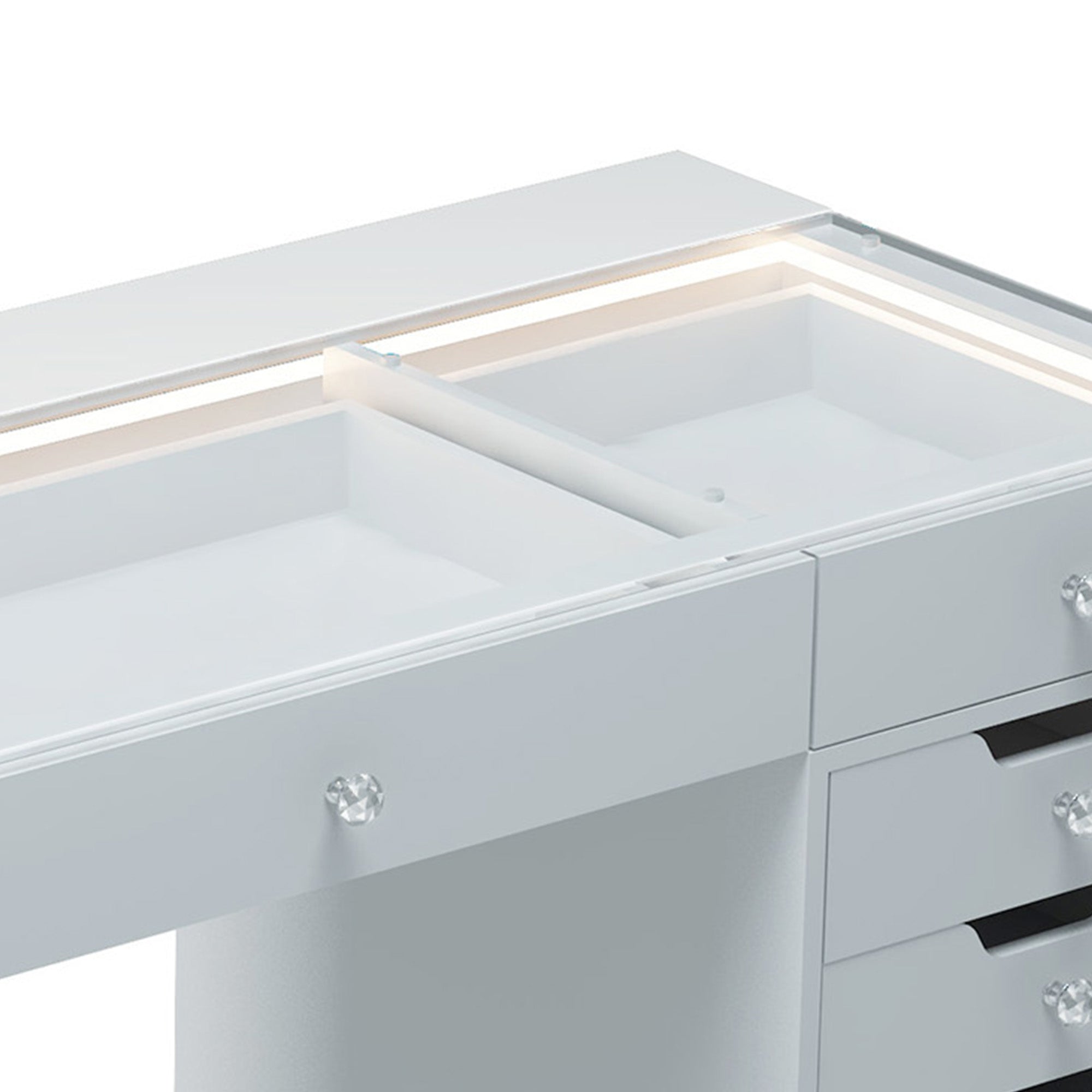 The built-in LED light strip enhances the charm of the jewelry storage space. Additionally, there is a USB port on the left side of the desk for convenient phone charging.