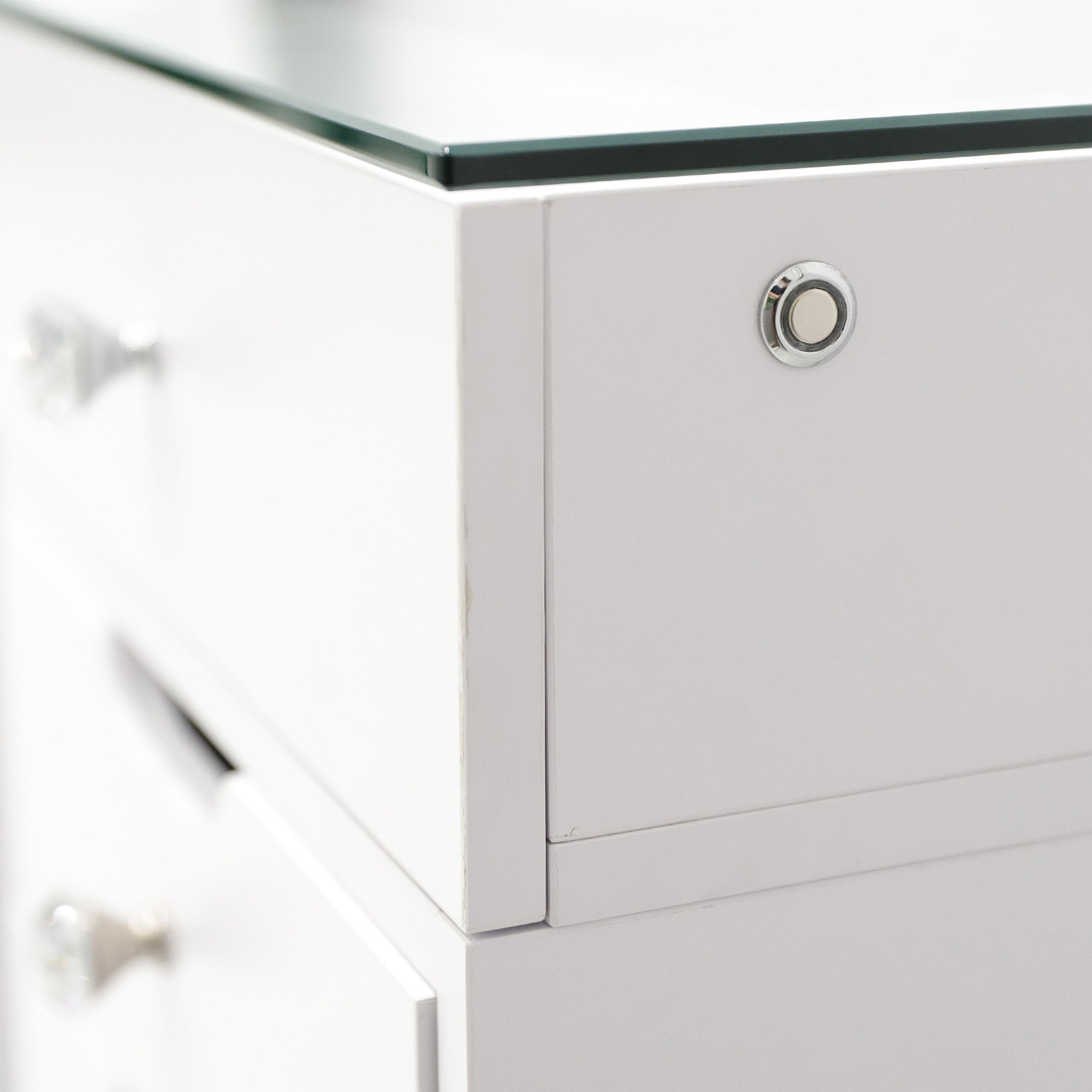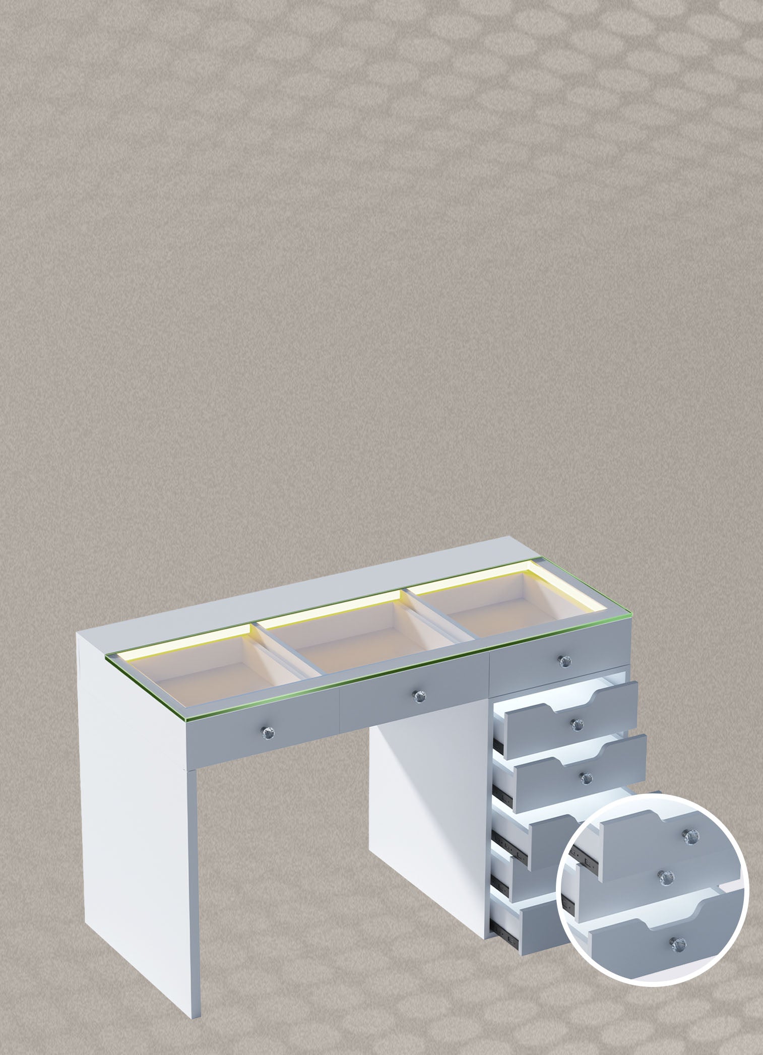 The built-in LED light strip enhances the charm of the jewelry storage space. Additionally, there is a USB port on the left side of the desk for convenient phone charging.