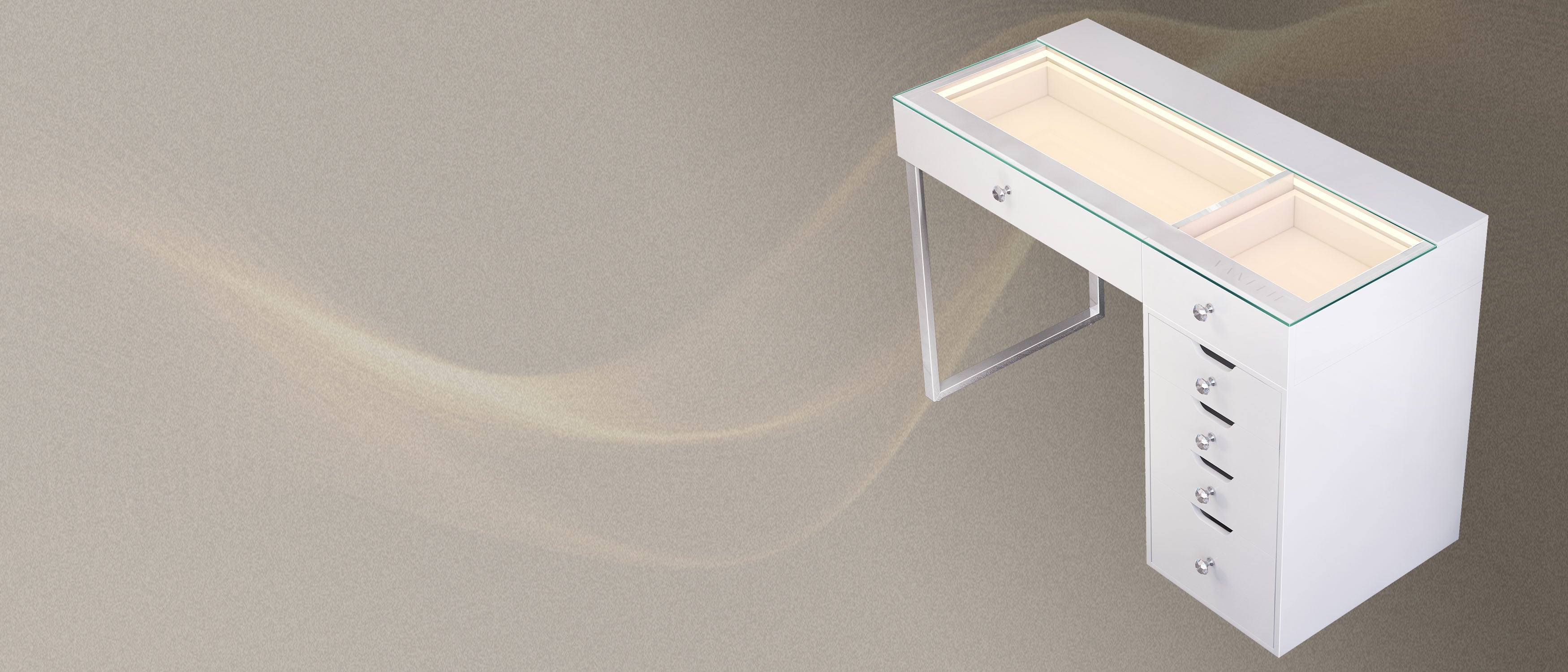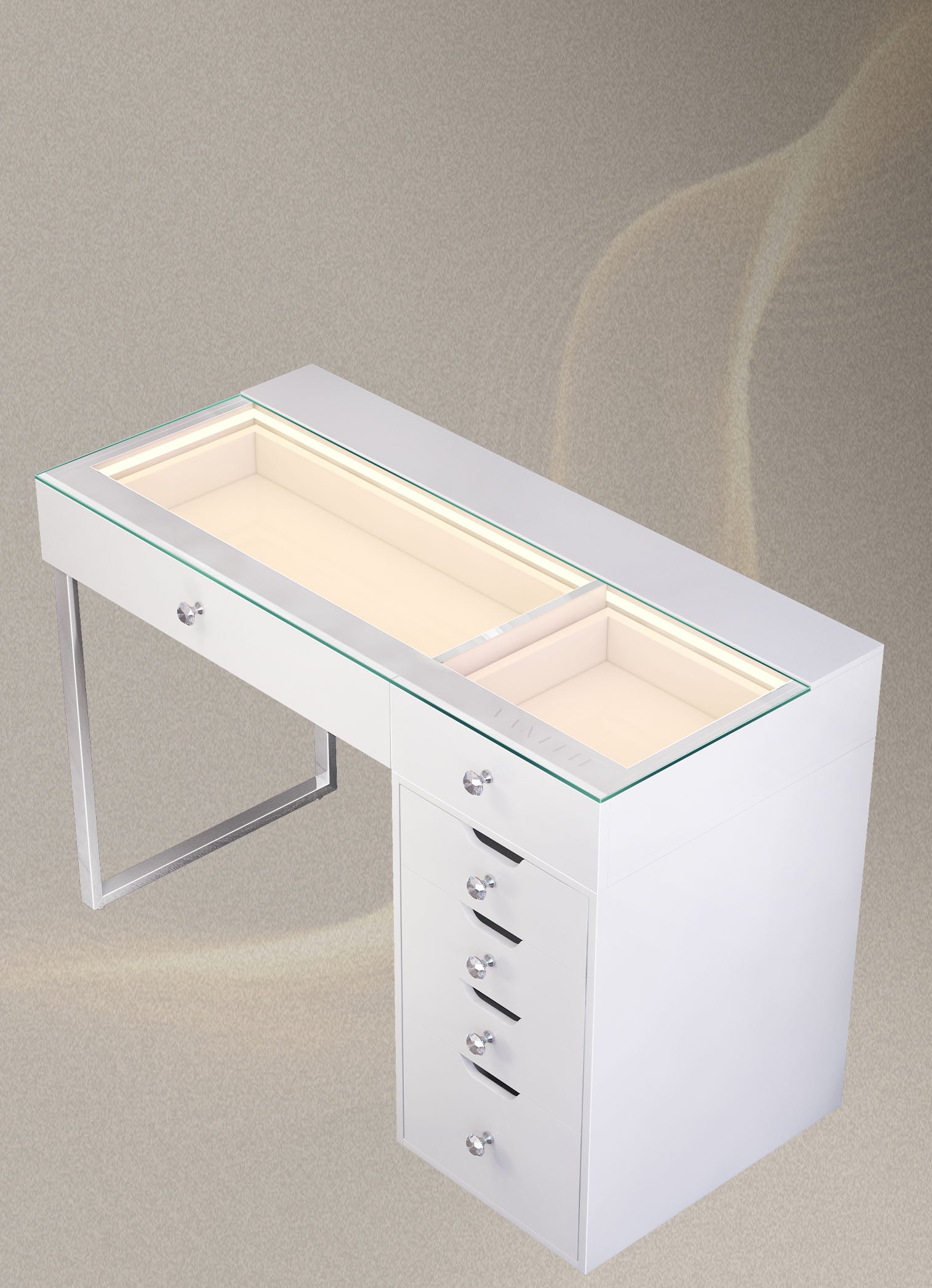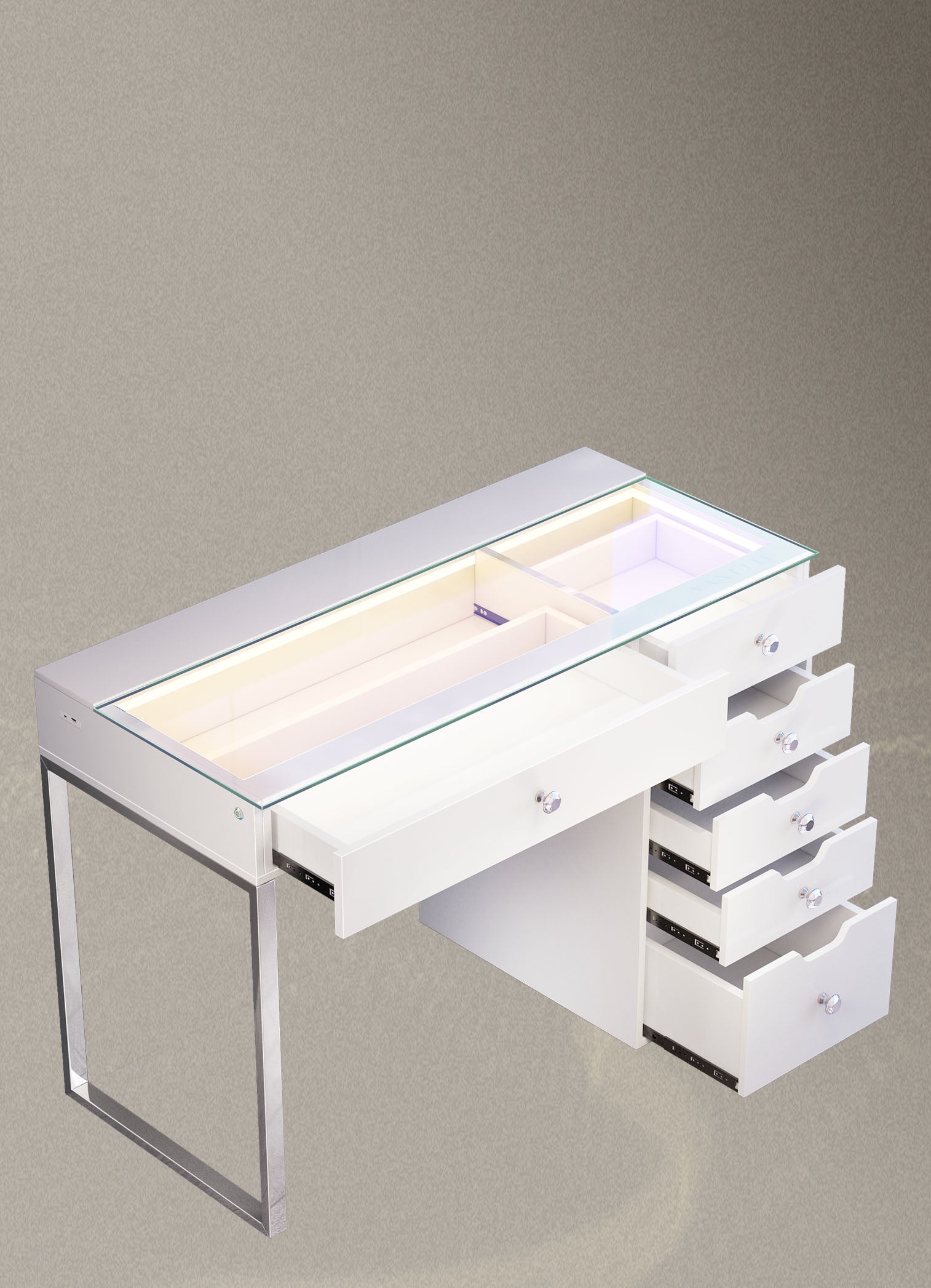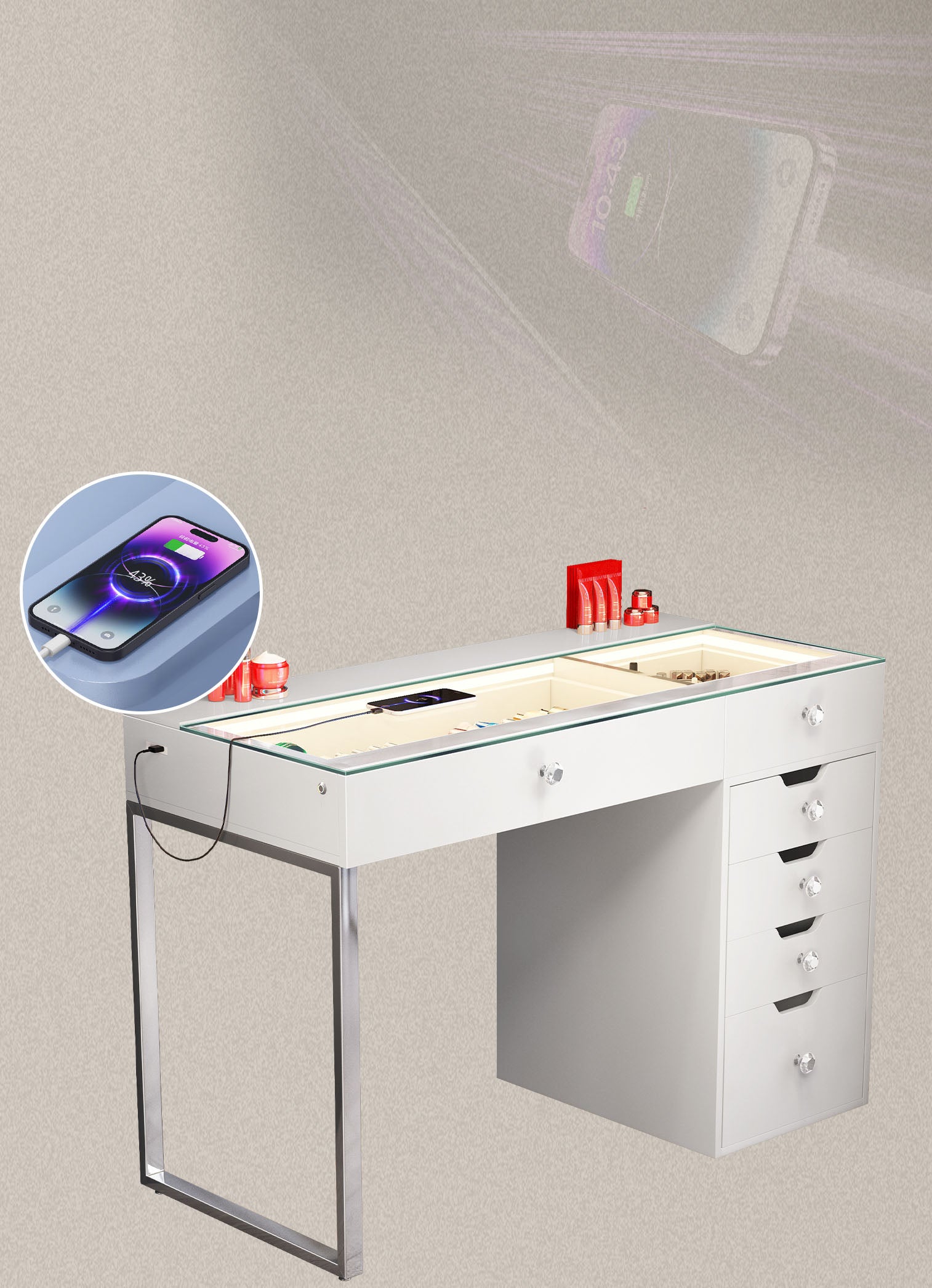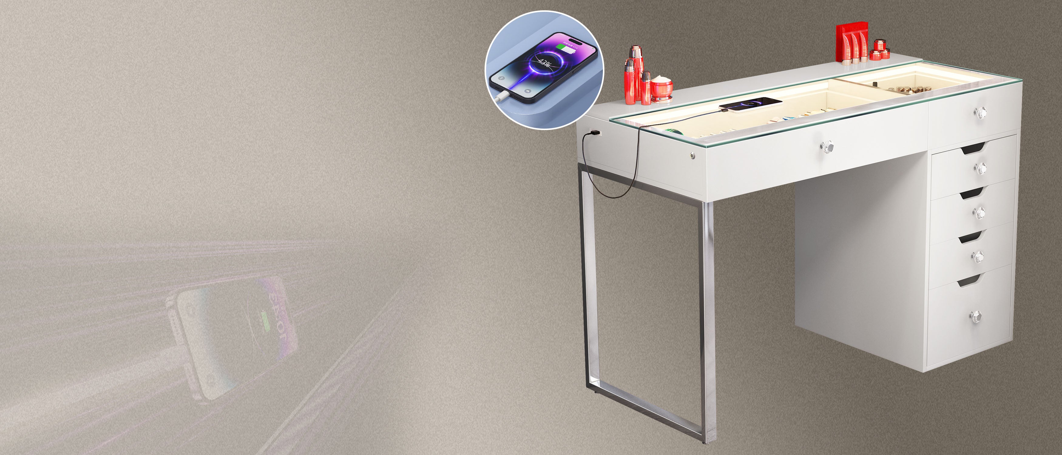 The built-in LED light strip enhances the charm of the jewelry storage space. Additionally, there is a USB port on the left side of the desk for convenient phone charging.