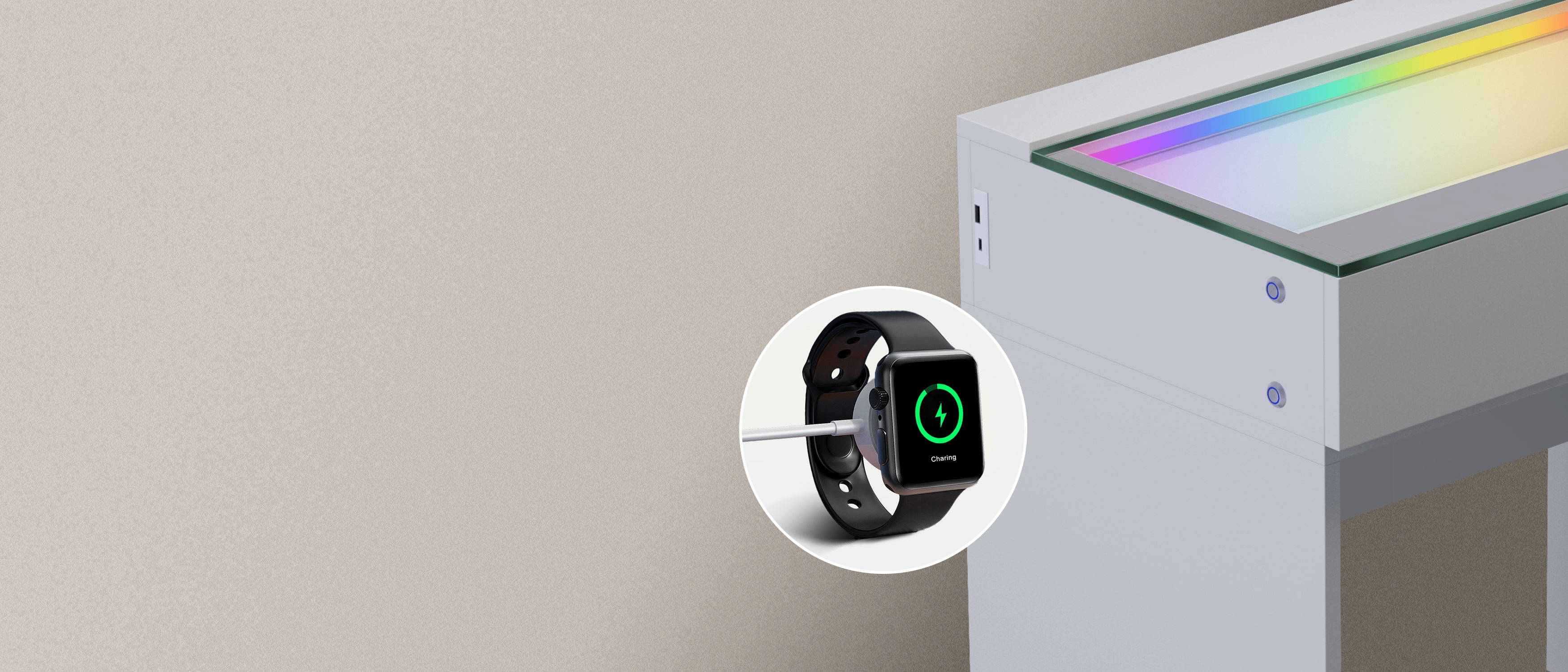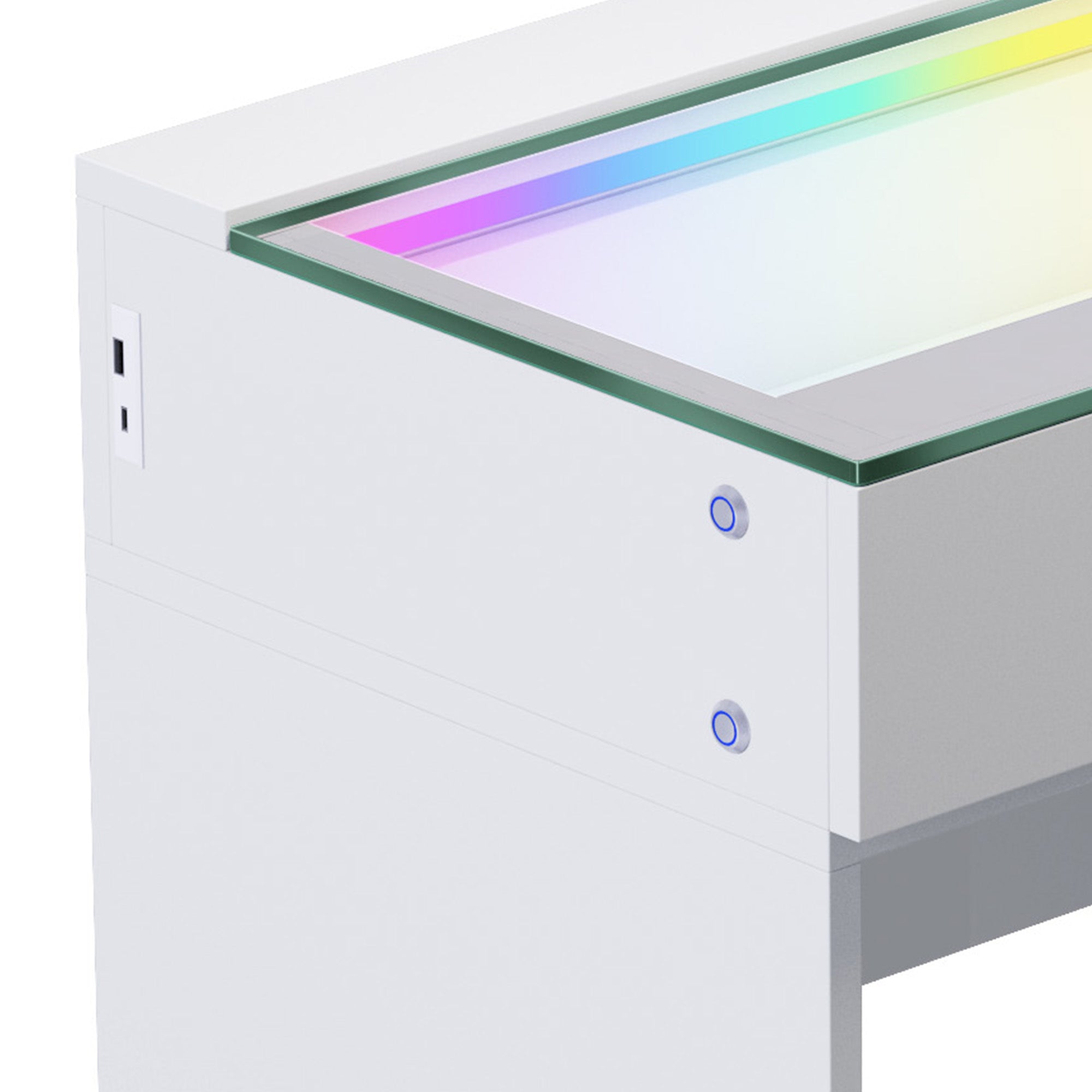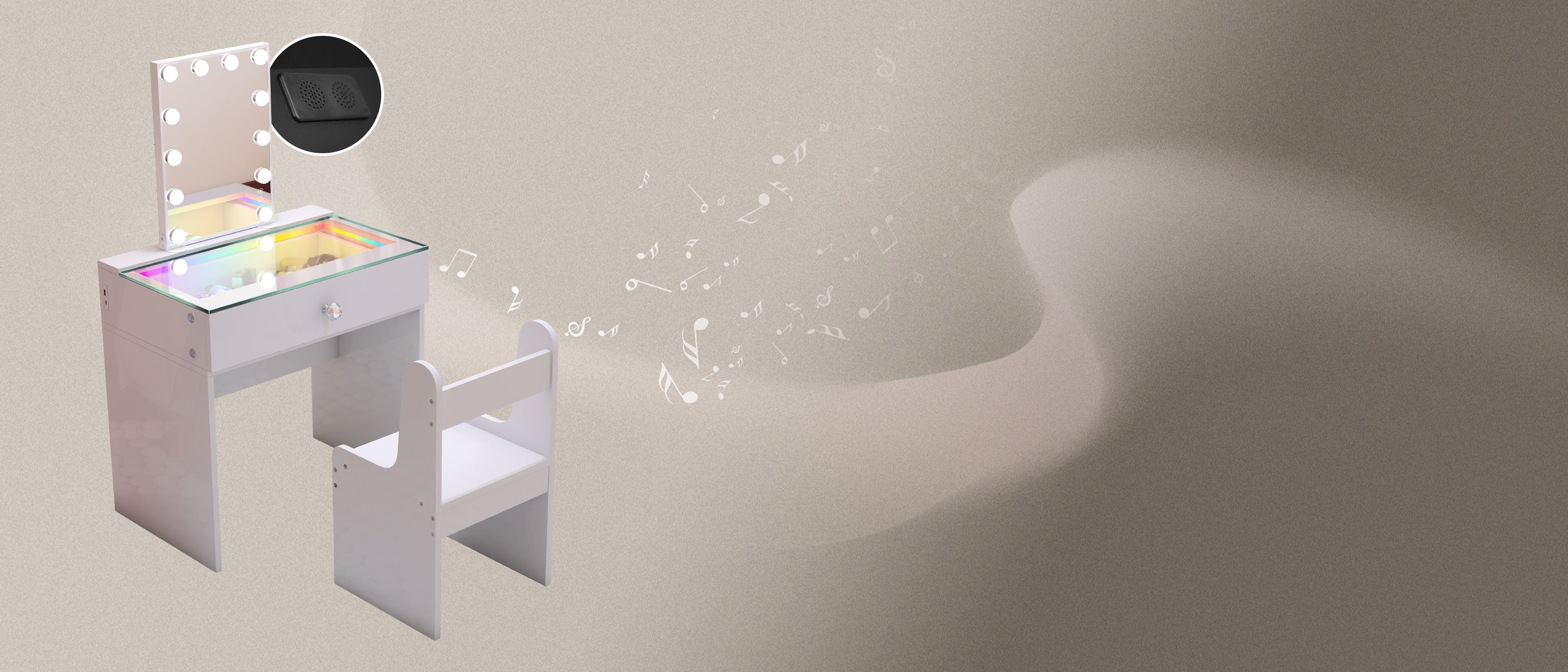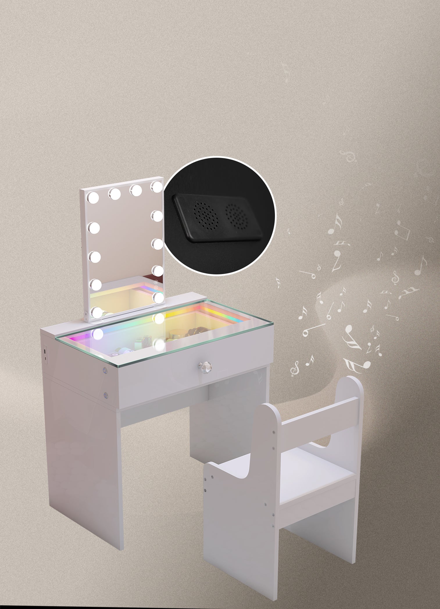The built-in LED light strip enhances the charm of the jewelry storage space. Additionally, there is a USB port on the left side of the desk for convenient phone charging.